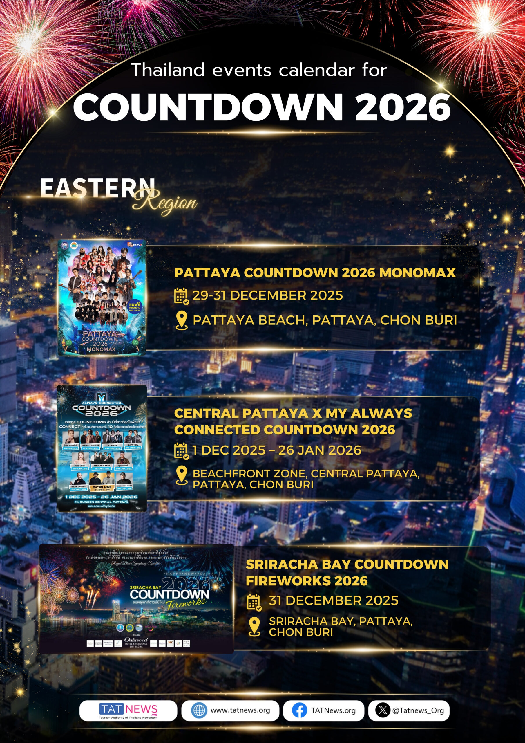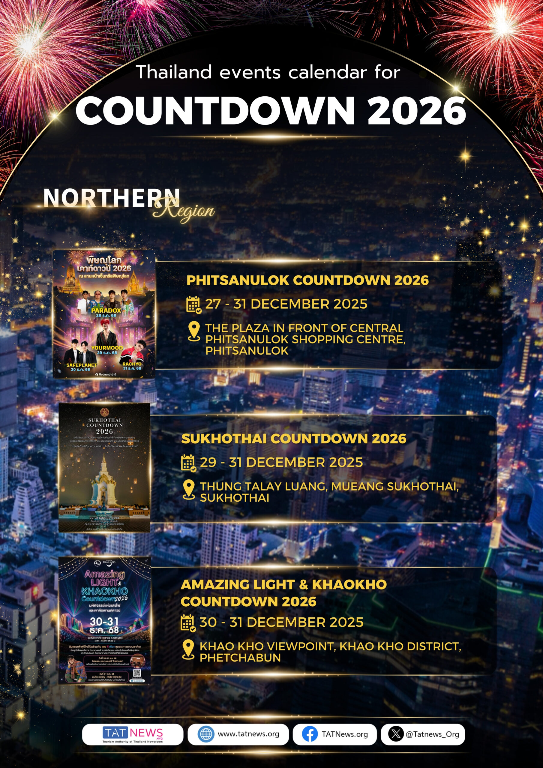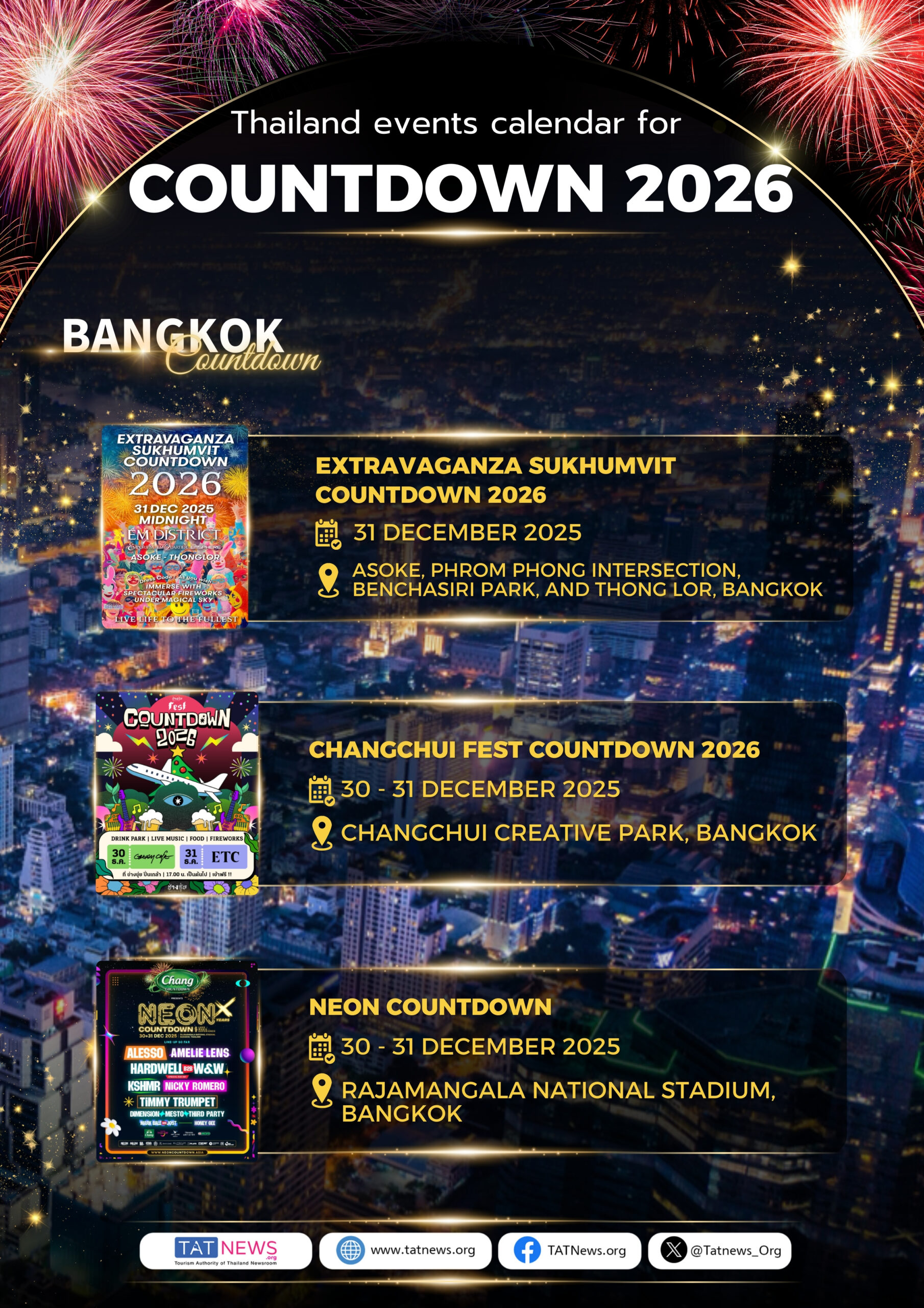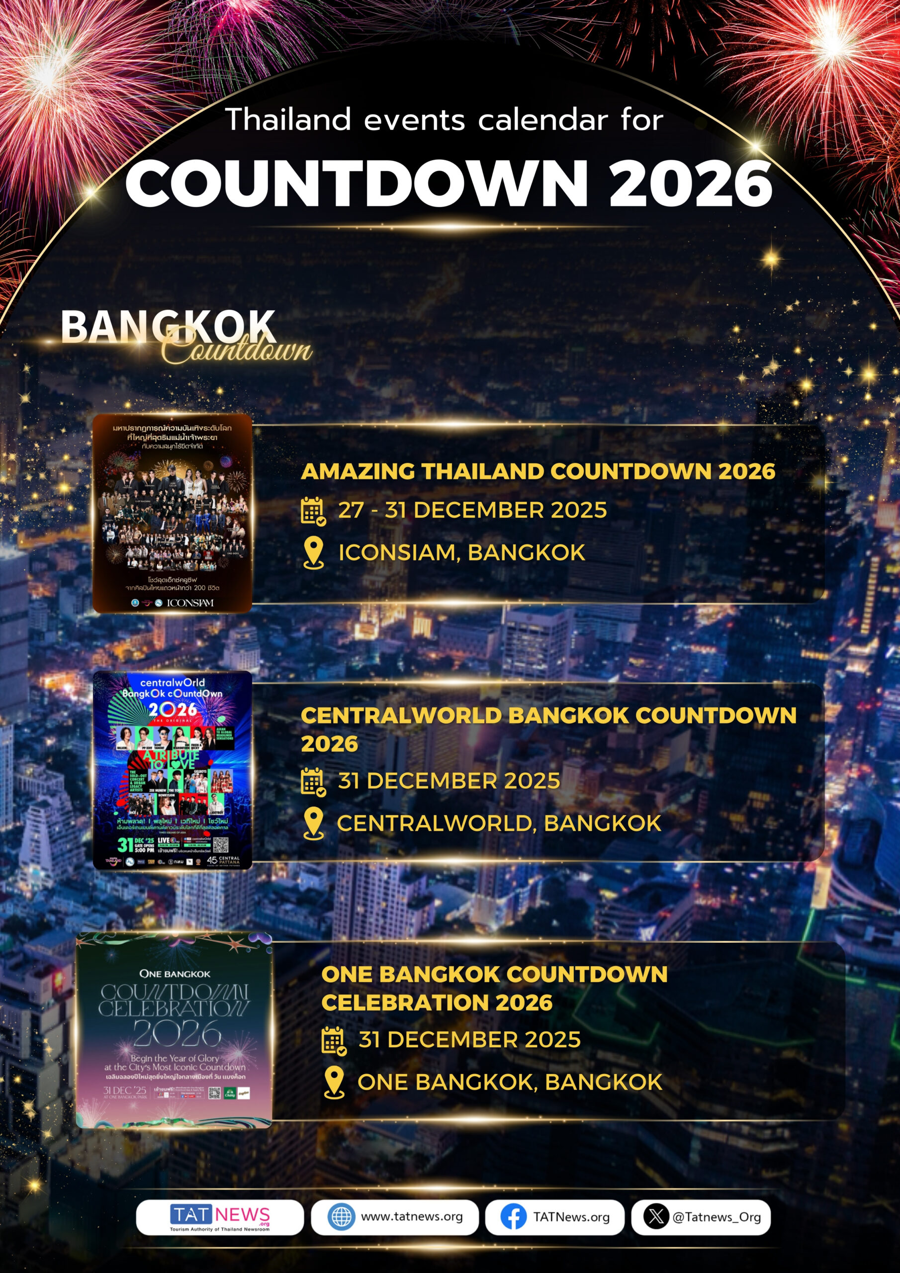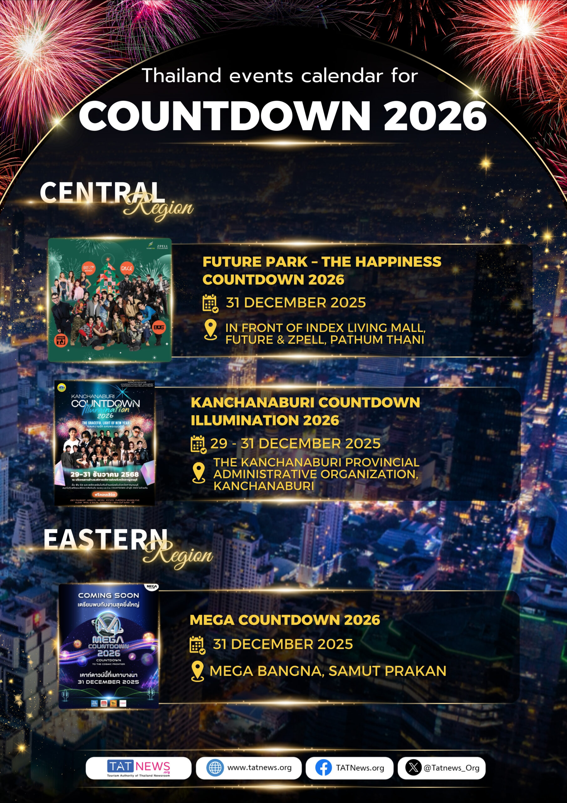 O Calendário de Eventos da Contagem Regressiva 2026 apresenta uma programação completa de celebrações de Ano Novo em todas as regiões do país. Em Bangkok, diversos locais emblemáticos sediarão grandes festividades de contagem regressiva, com queima de fogos, shows ao vivo e celebrações urbanas imersivas. Além da capital, províncias de todas as regiões darão as boas-vindas ao Ano Novo com eventos locais distintos, onde cada evento reflete a identidade única do seu destino, ao mesmo tempo que contribui para uma celebração unificada em todo o país.
