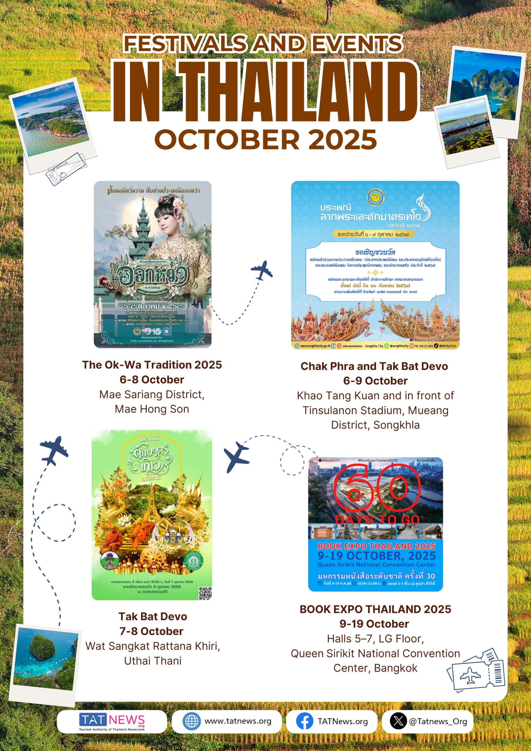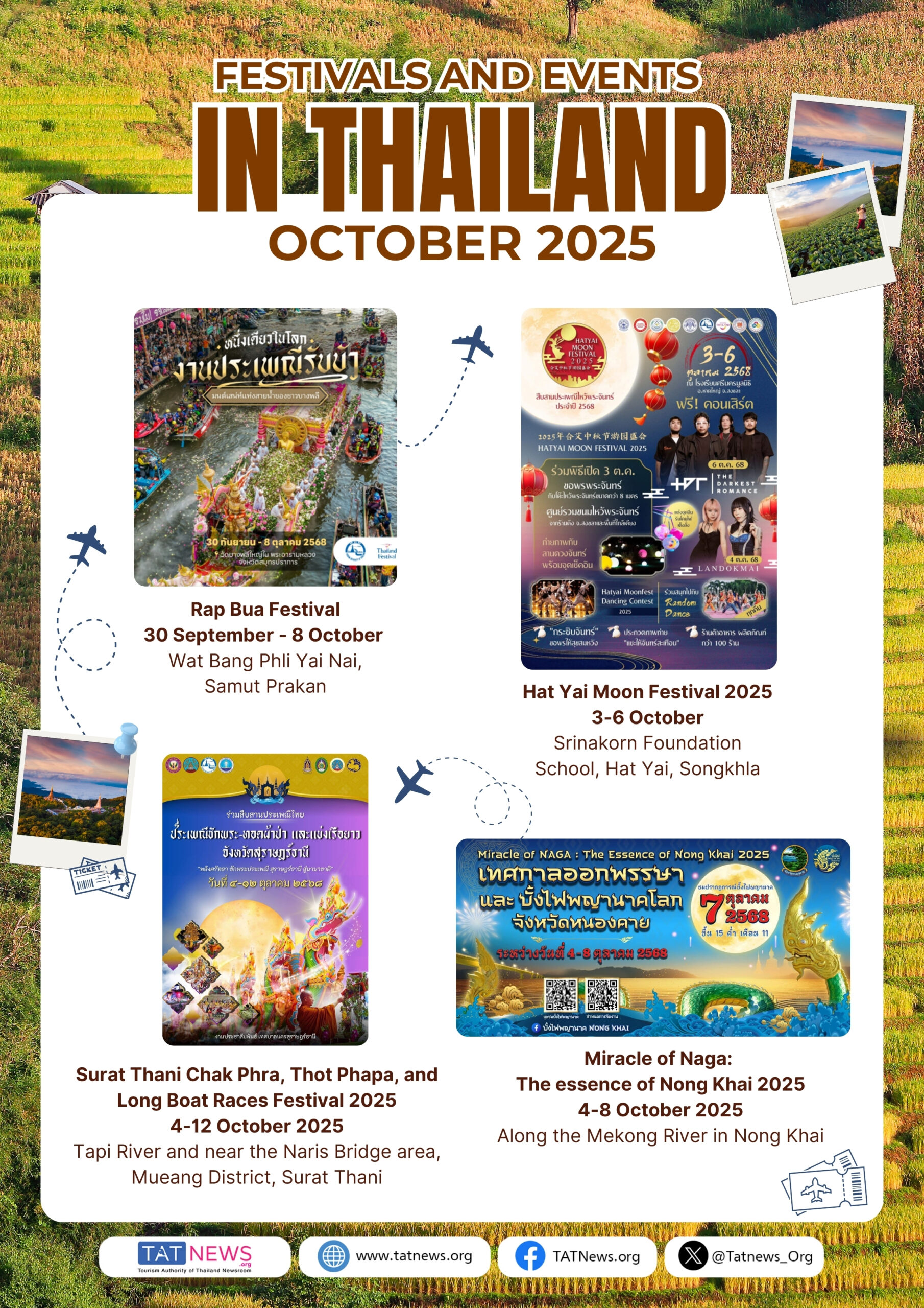 Em outubro de 2025, mergulhe nas vibrantes tradições e celebrações culturais da Tailândia. Descubra o singular Rap Bua Festival em Samut Prakan, vivencie os animados festivais de Surat Thani Chak Phra, Thot Phapa e Long Boat Races, e maravilhe-se com as misteriosas bolas de fogo que se erguem sobre o Mekong durante o Nong Khai Ok Phansa e Bang Fai Phaya Naga Festival. Com inúmeras festividades culturais em todo o país, outubro é a época perfeita para vivenciar a rica herança e o espírito festivo da Tailândia.