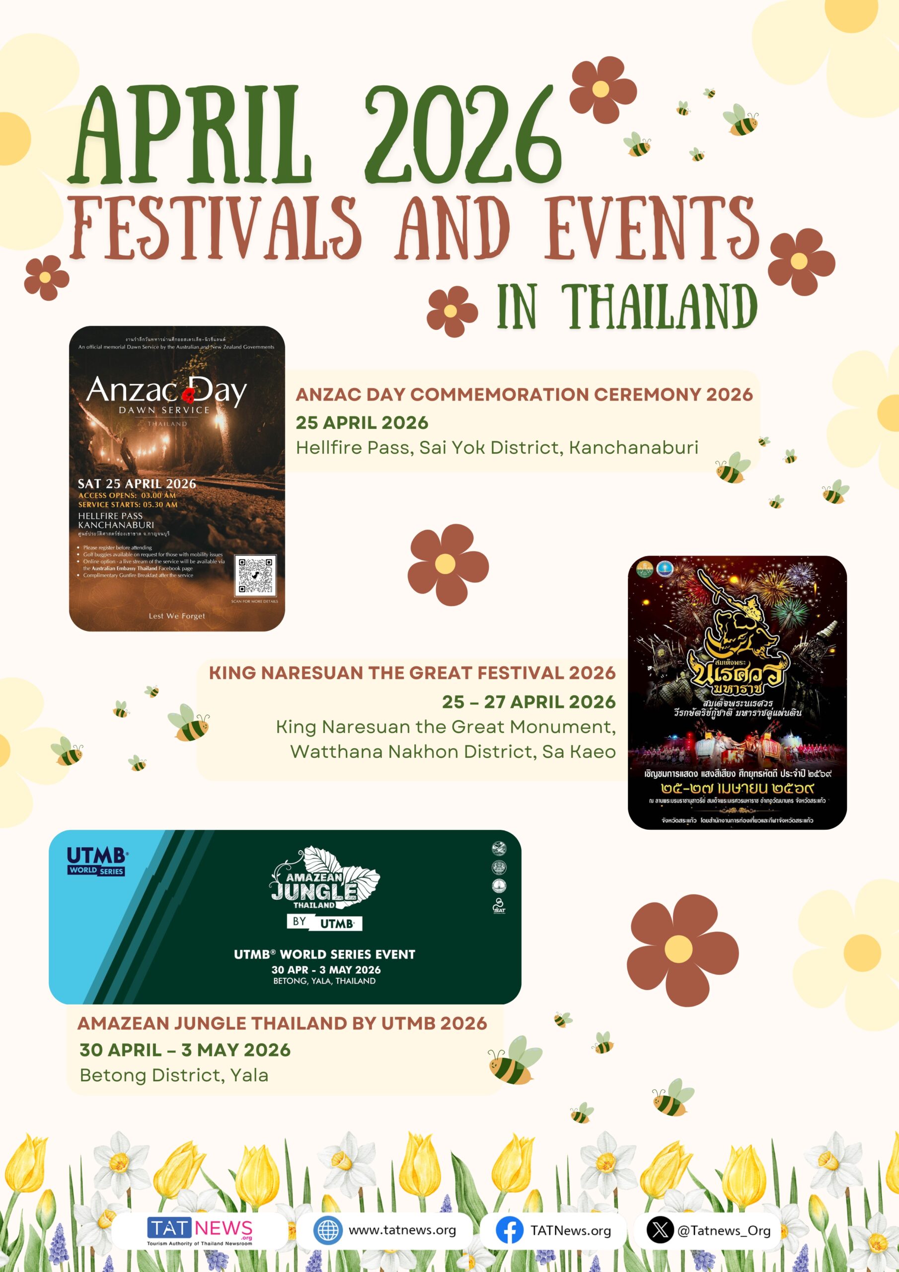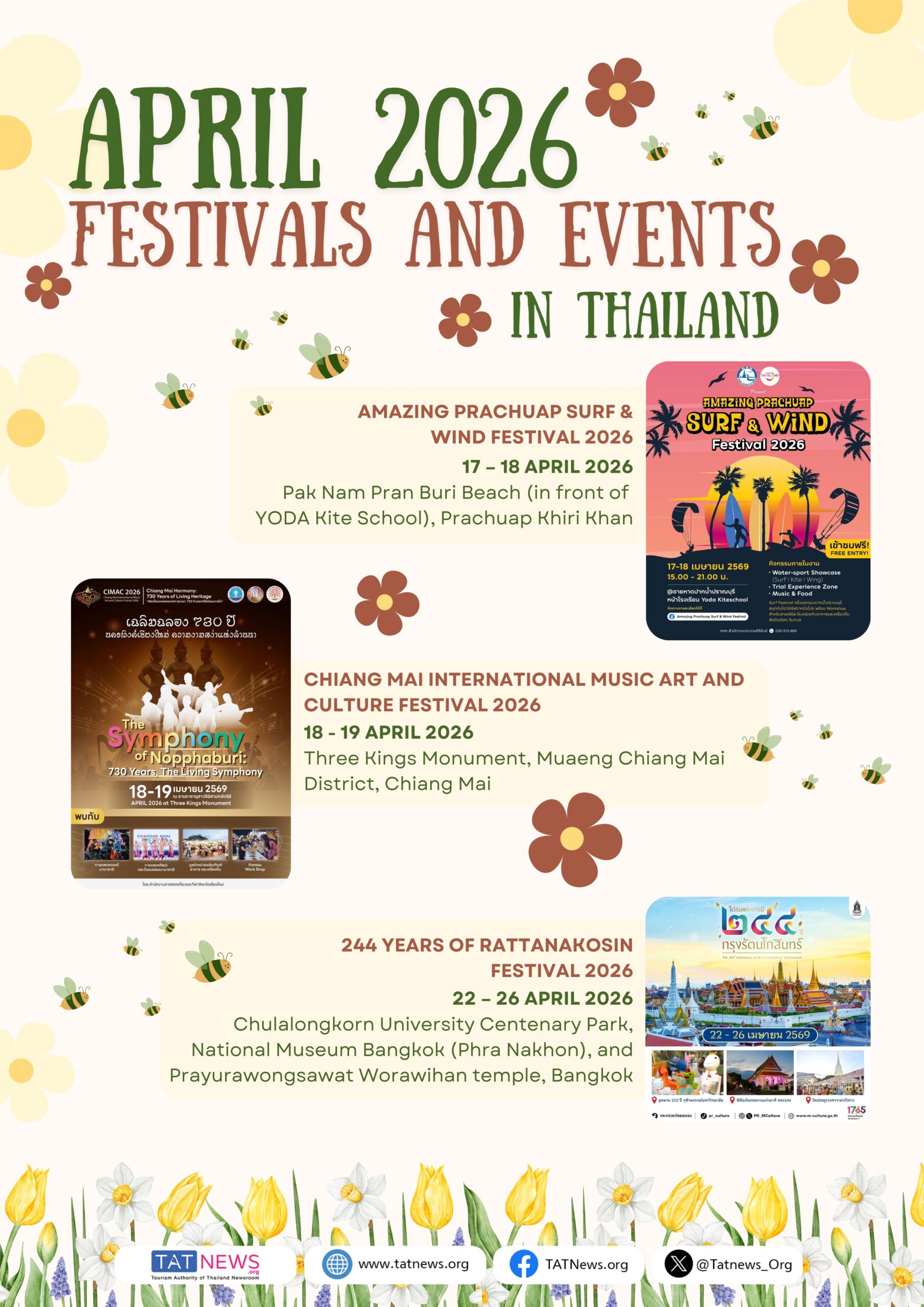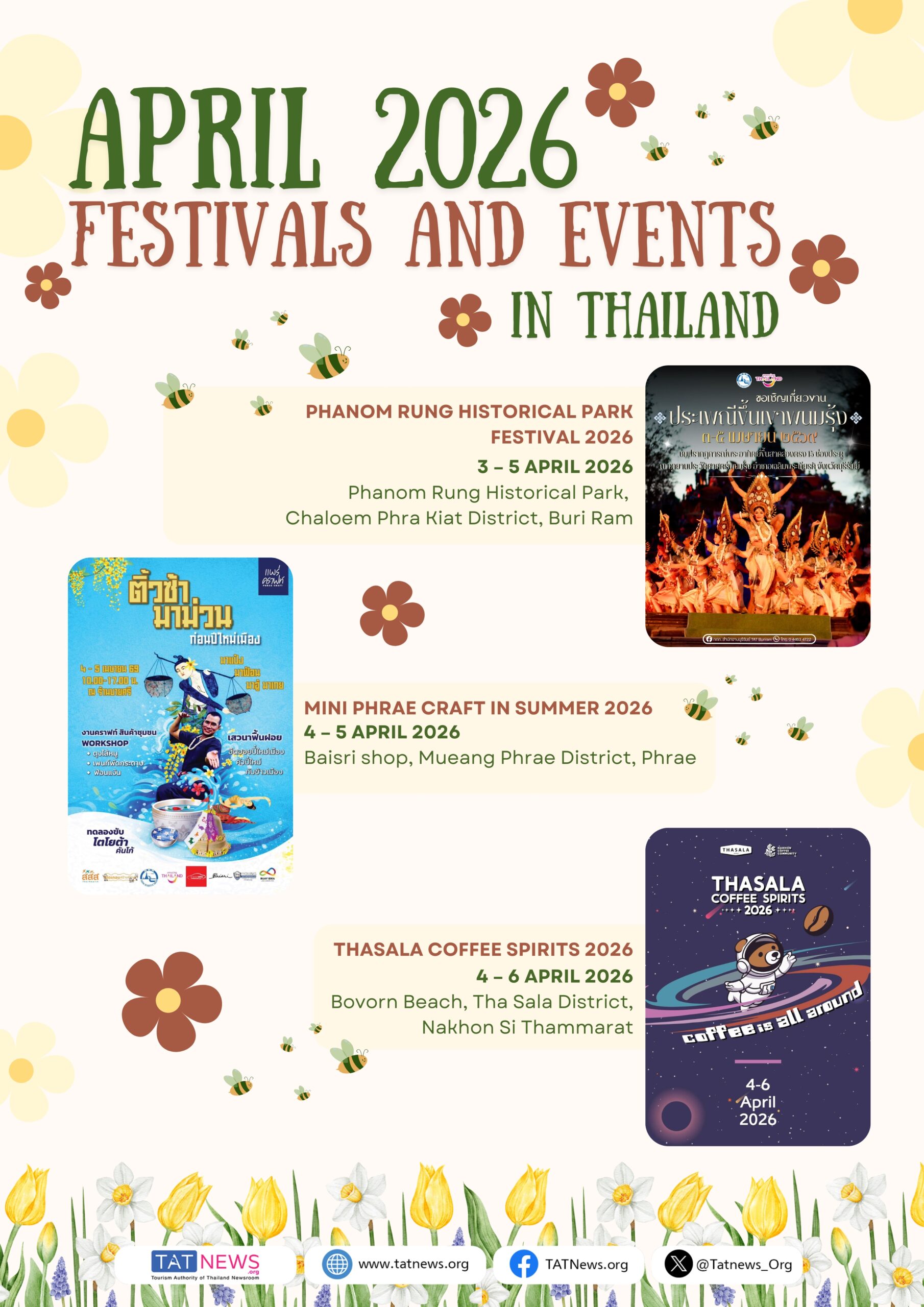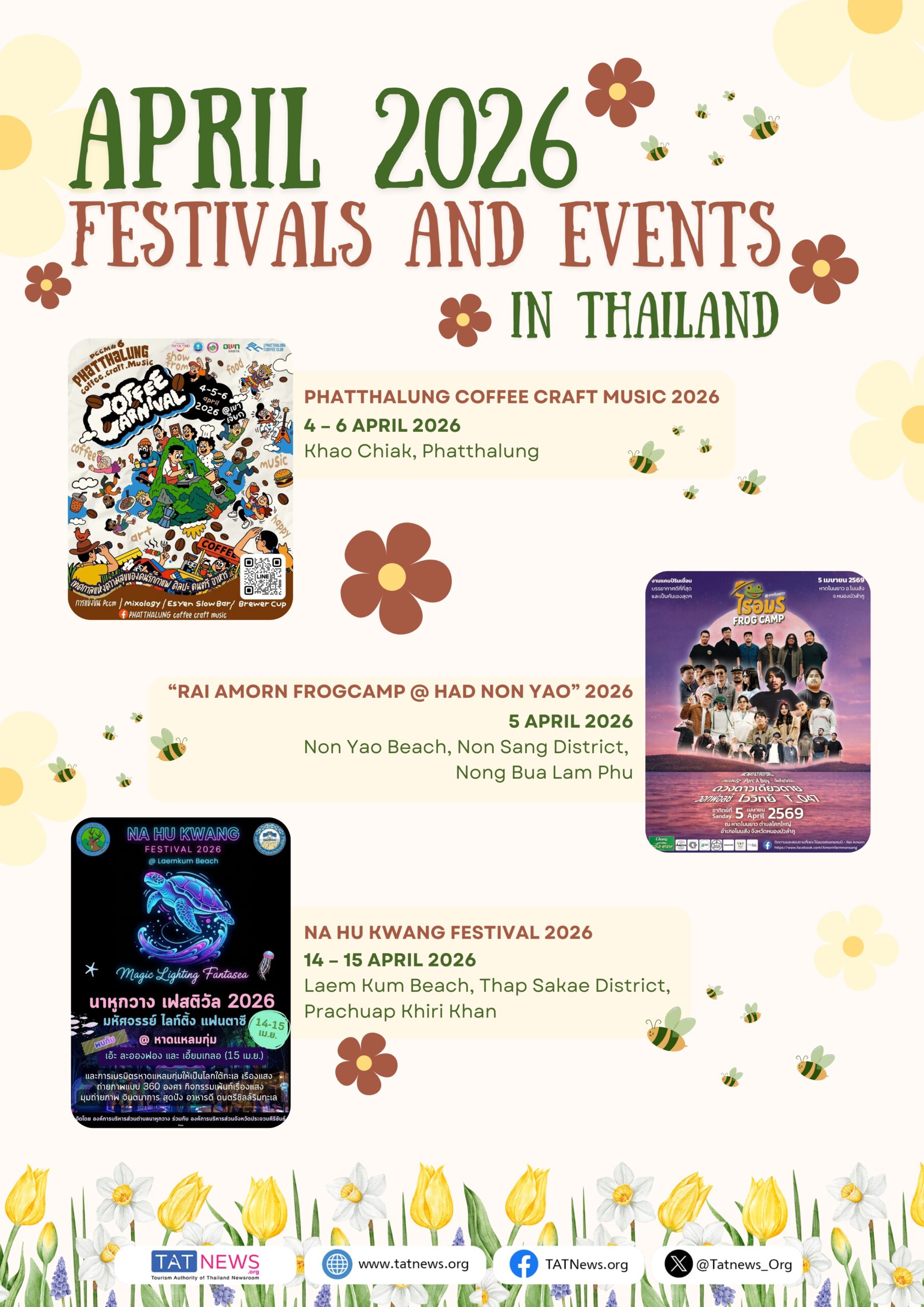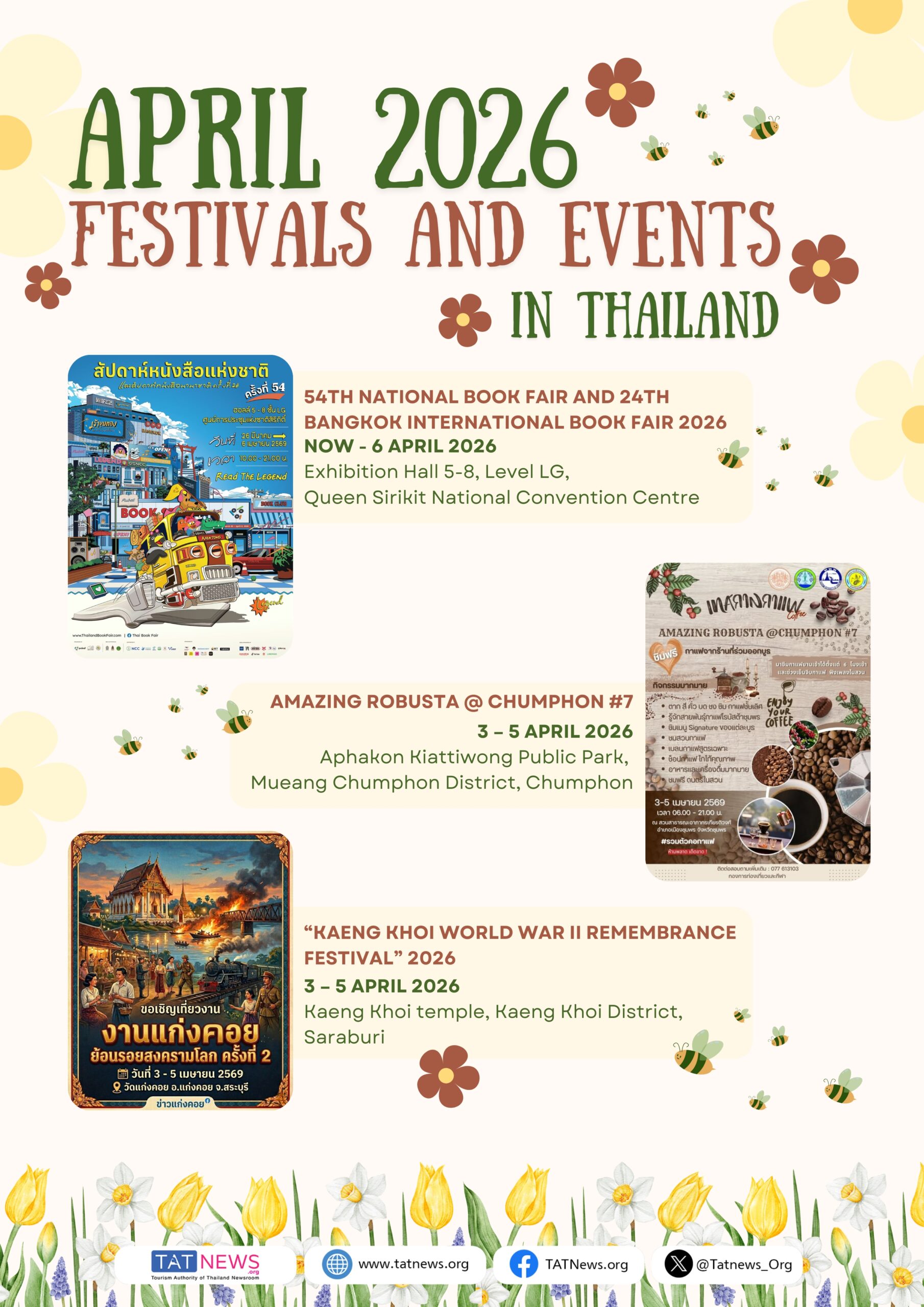 Abril celebra o espírito vibrante do verão com festivais, cultura e muita festa. Descubra os destaques literários na 54th National Book Fair and 24th Bangkok International Book Fair 2026, e aproveite as festividades litorâneas no Festival Na Hu Kwang Festival 2026 e Amazing Prachuap Surf & Wind Festival 2026. Saboreie os sabores locais no Amazing Robusta @ Chumphon #7 e conheça a história no Kaeng Khoi World War II Remembrance Festival. Vivencie o patrimônio cultural Phanom Rung Historical Park Festival 2026 e divirta-se no Phatthalung Coffee Craft Music de 2026, além de muitos outros eventos que acontecem em todo o país.